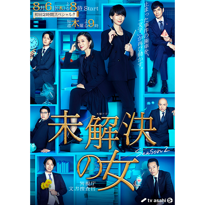 2018年4月期放送のSeason1では真っ赤なビジュアルが印象的だった『未解決の女 警視庁文書捜査官』のポスターですが、今回は夏の放送ということで、爽やかな青色をベースにデザインも一新することに! 背景には「膨大な書類をもとに未解決事件を解決していく」という物語、そして警視庁捜査一課「特命捜査対策室」第6係(文書解読係)の部屋を象徴するべく、“たくさんの書類やダンボールで埋め尽くされた世界”を構築。また、波瑠&鈴木の最強凸凹バディを中心に各キャストをパズルのように組み合わせることで、個性豊かなキャストとの人間模様も伺わせるビジュアルとなっています。