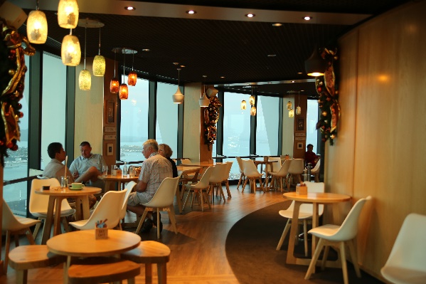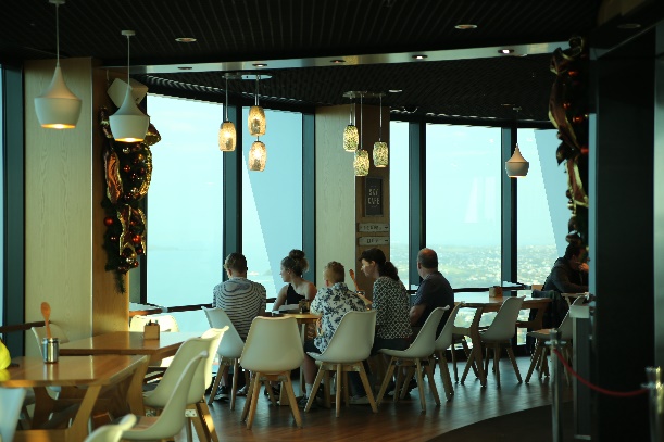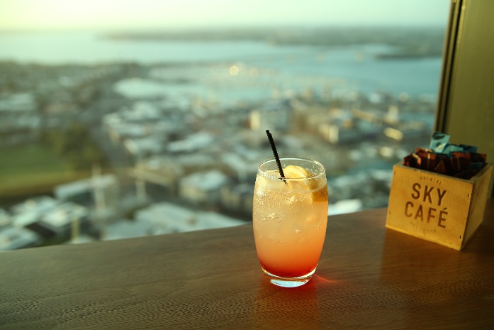 展望デッキにある「Sky Café」が居心地がいい。ゆっくりとサンセットを過ごすことができた。写真のドリンクはニュージーランドベリー&ライムソーダ。