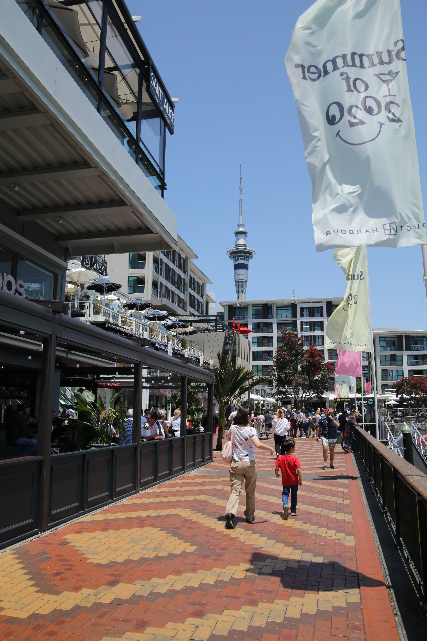 バイアダクトハーバーの背景にそびえ立つスカイタワーはオークランドのシンボル的存在。