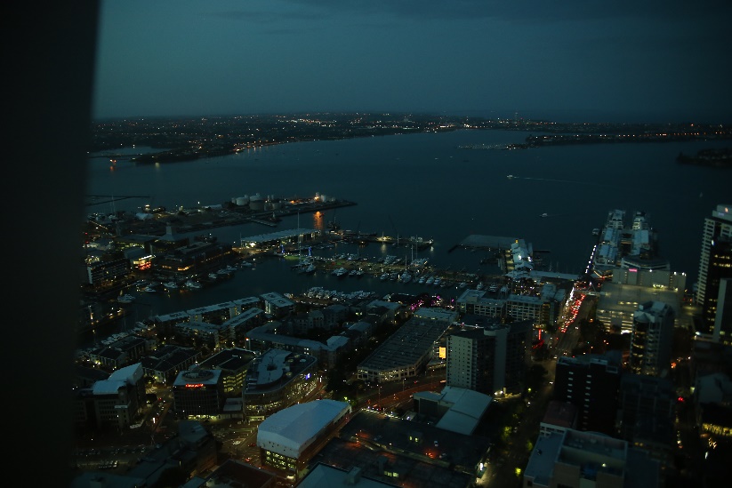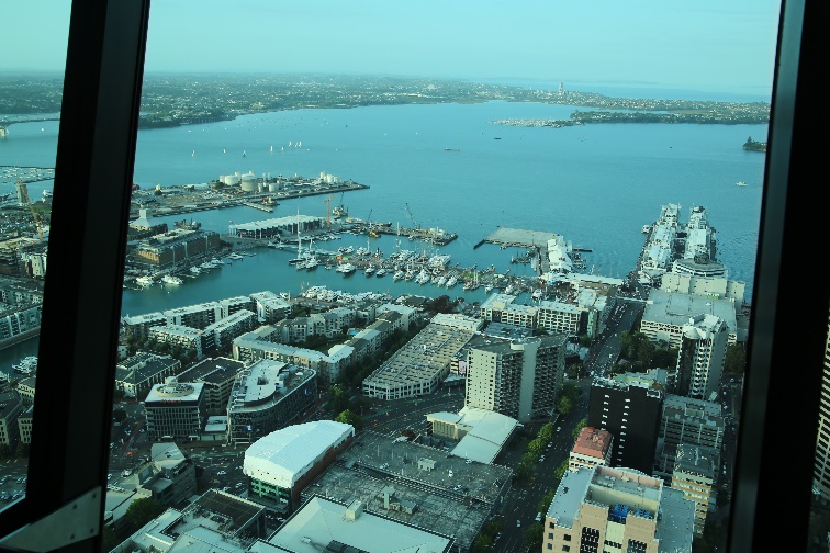 高さは328メートルで南半球で一番高いタワーの展望デッキからはオークランド周辺のいくつものハーバーを一望できる。