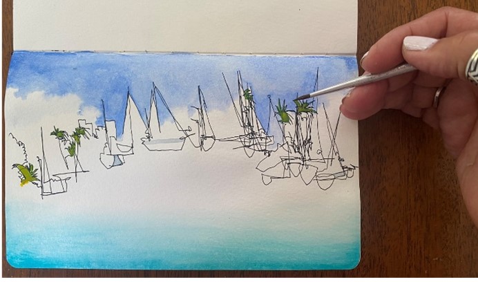 その手法でココナッツグローブのマリーナに浮かぶヨットをあっという間に描き上げます。
