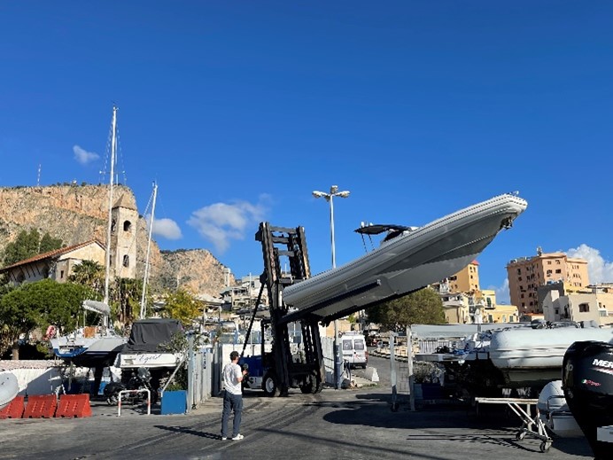 大型パワーリフトで船を持ち上げる様は迫力そのもの