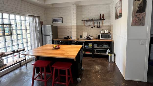 ブロックガラス窓のある明るいフルキッチンがあり、