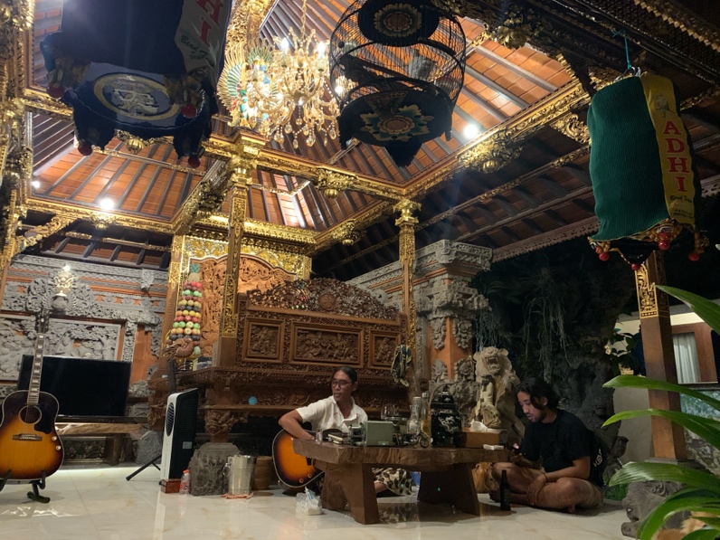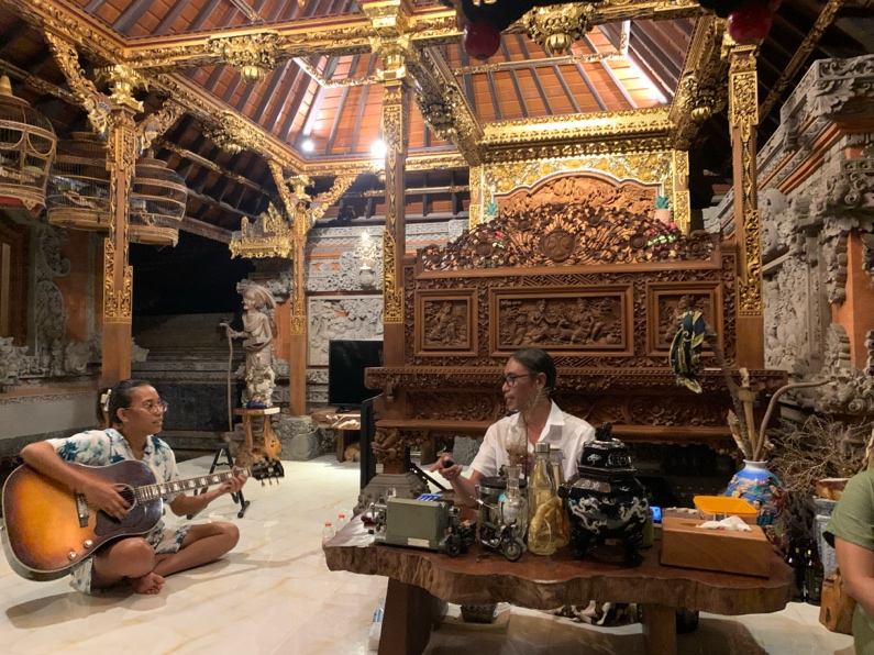 店から20分ほどのサヌールの自宅にお邪魔すると、たくさんの鳥や、クラシックバイク、ギター、バリ伝統の彫刻が施された刀などの彫刻品などのコレクションが飾られていました。彼は相当な収集家でした。