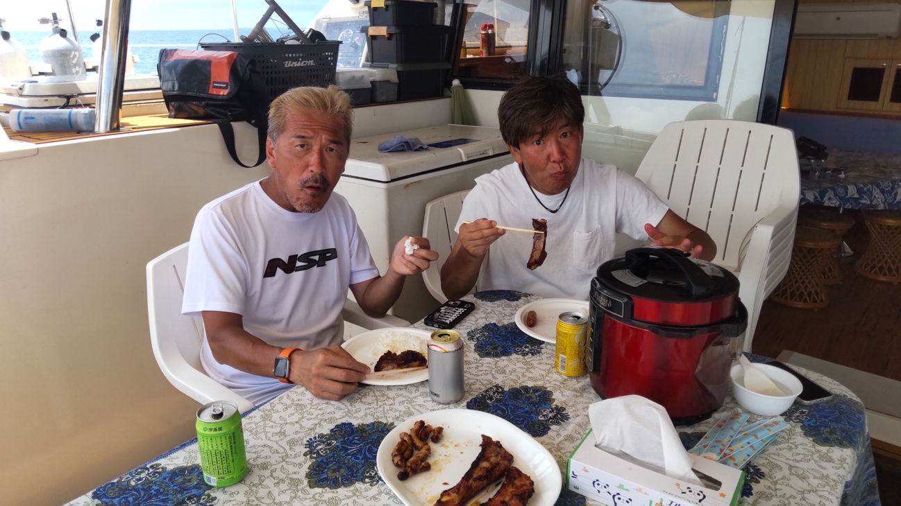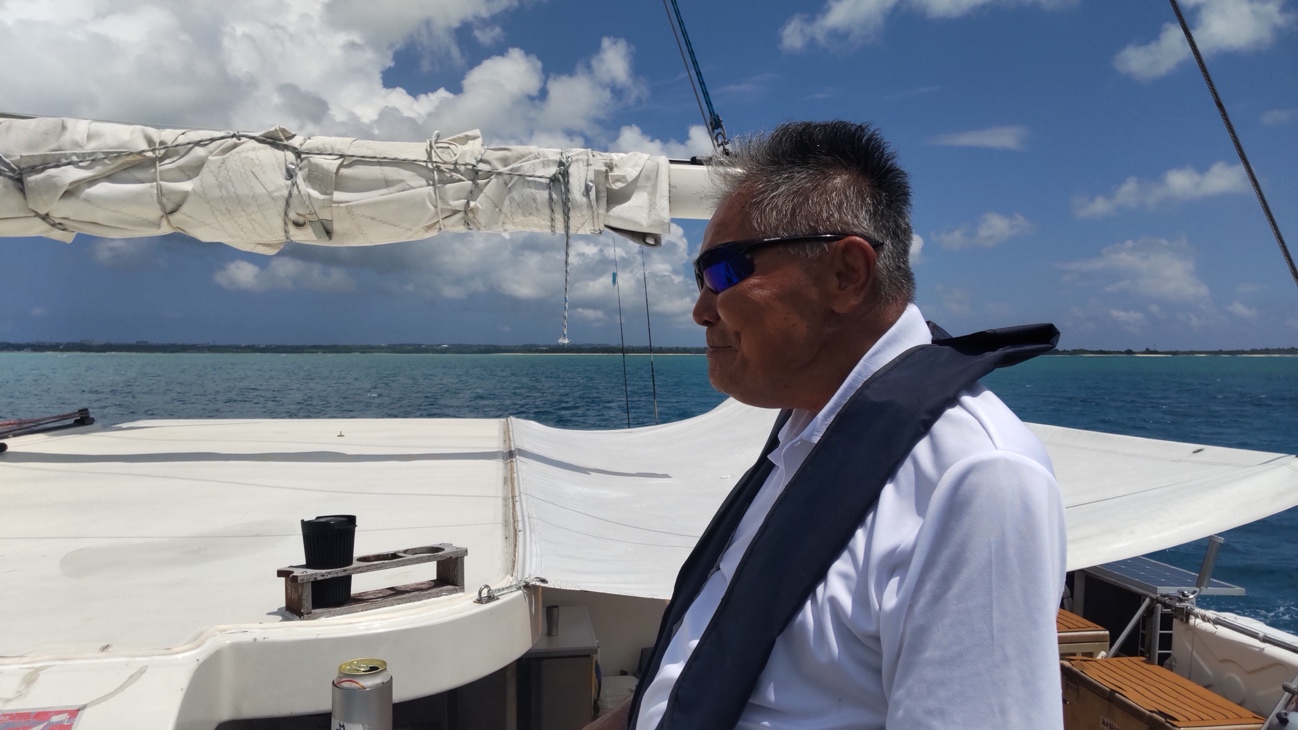 海の上で食事も頂き、おかげさまで取材を飛び越えたささやかな夏休みを送ることができました(写真は担当ディレクター)。やっぱり宮古の海では避けては通れなかった方でした。