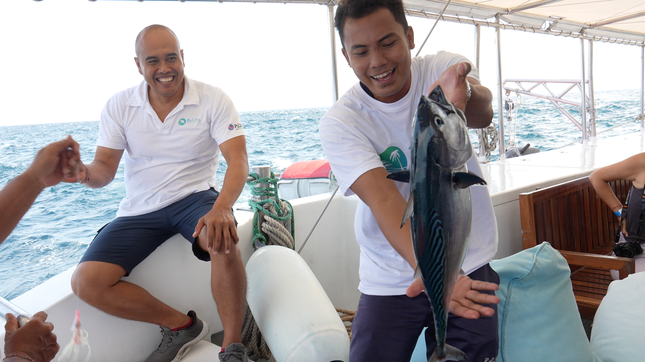 一方、反対側のデッキでは観光客だけでなくクルーもリラックス。釣りを楽しんでいました。 そしてなんと、大きな魚をキャッチ!豪華なランチになりそうです。