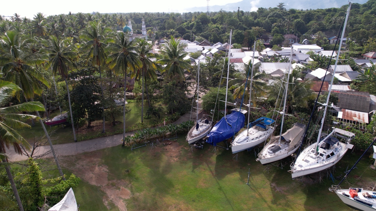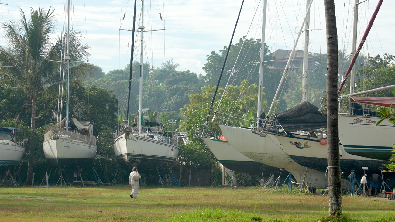 普段は海に浮かんでいるヨットが陸に上がり、椰子の木々に囲まれている様子は、まるで巨大なロボットが集まっているかのよう―。