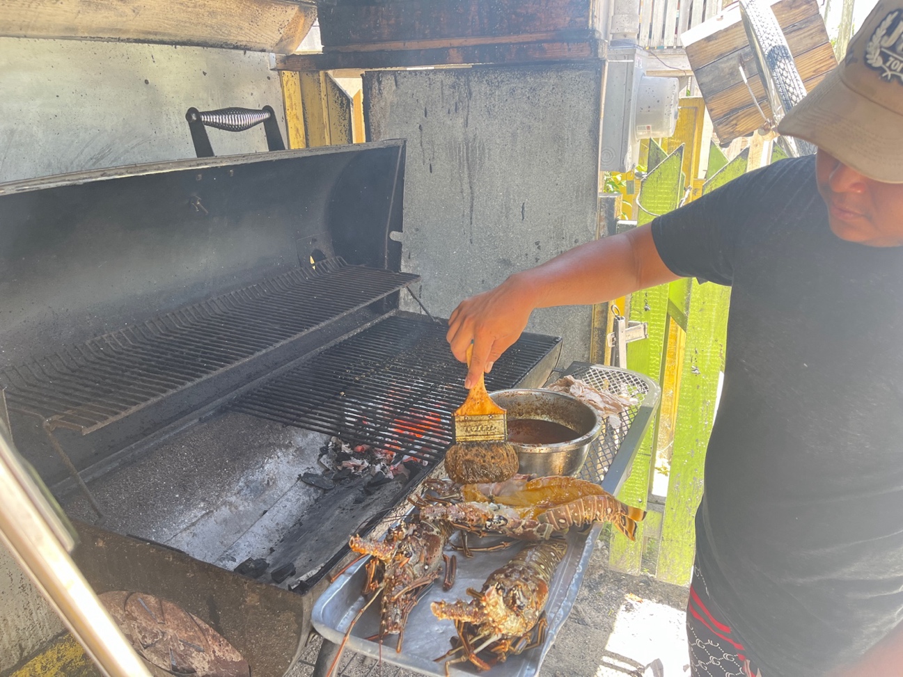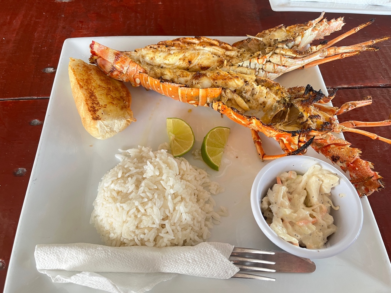 食事時、キーカーカーの道端にはガーリックバターでグリルされるロブスターの香ばしい匂いが立ち込めます。大きな一尾を縦に真二つに割り、丸ごと豪快に焼かれるロブスター定食の値段はおよそ20USドルと驚きの安さ。