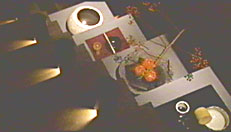闇の中に怪しく光る灯りに誘われて玄関をくぐるとそこは和みの空間。美味しい料理は、料亭出身の料理人が作る、旬の素材をいかした新京風料理。赤いカクテルの中を泳ぐ泡が幻想的に感じられました。