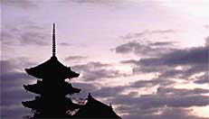 東寺・五重塔に射しゆく朝日。流れゆく雲