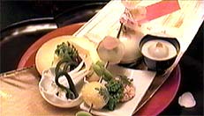 どうどうたる佇まい「祇園・丸山」。ご主人の丸山嘉桜さん。季節の移ろいを味におりこんでいきます。そして「光・音・香」にも心を配る。目にも鮮やかな金箔光琳盛りができました。春を愛でる心が込められています。