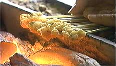 今宮神社の参道にある「一和」。お参りの後は、名物の「あぶり餅」をいただきます。今宮神社と共に1000年の歴史があります。手作りの竹串に、きな粉をまぶしたお餅を刺し、炭火であぶって、焦げ目をつける。甘い白味噌をたっぷりと付けてできあがり。病を払ってくれるという御利益もあるありがたいお菓子です。