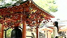 八坂の塔の下、店々の軒下に吊してある奇妙な物が目に付きます。地元の人に「こうしんさん」と親しまれている金剛寺八坂庚申堂に、その秘密がありました。門の上には三猿。そして境内には沢山の「くくり猿」。猿は、願いを叶えるため努力をする人を助ける庚申さんの遣いでもあります。