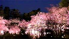 青い春の空に朱塗りの社が映える平安神宮。春の陽射しにさそわれ、境内の枝垂桜もいっそう輝いています。夜の帳がおりると浮かび上がってくる雅な夜桜。幻想的な紅枝垂。夜桜の美が心を打つ、春の宵です。