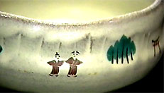 「赤膚焼 正人窯」 400年ほどの伝統を持つ赤膚焼き。その伝統を受け継ぐ正人窯。(まさんどがま)現在では、茶器や日常に使う器などを作っています。奈良絵と呼ばれる柄は、室町時代の御伽草子の挿絵を模したもの。現在は、正倉院の御物をモチーフにした天平文様など、伝統を踏まえた新たな絵柄も作り出されています。見ていると心がほっこり暖かくなる、そんなぬくもりのある、奈良絵茶碗です。