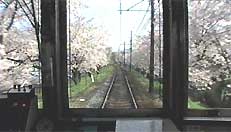 「京福電車」 四条大宮から嵐山方面に向かう小さな電車、京福電鉄嵐山線、通称「嵐電(らんでん)」。桜が満開を迎える頃、鳴滝駅〜宇多野駅の間では車内から桜を見ることが出来ます。車窓いっぱいに広がる桜の花、まるで桜のトンネルを走っているかのようです。 ※ディレクターからのひと言 3/31〜4/8には夜間ライトアップも行われ、この区間は車内灯も消され速度を落として走行します。踏み切り脇から列車の様子も撮影できますが、余り近づき過ぎないよう気を付けてください 。
