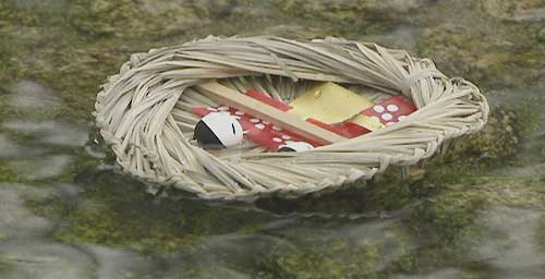 3月3日のひな祭り、下鴨神社で行われる「流し雛」。わらで編んだ「桟俵(さんだわら)」に乗せた紙の雛人形を境内の御手洗川に流し、子どもたちの無病息災を祈る神事です。ひな祭りは、もともとケガレを雛に託してお祓いする神事だったとか。流し雛は色紙などを使って作った男女二人の雛人形が用いられ、一般的な雛人形と比べれば簡素ですが、水に浮かんでユラユラと流れるさまには、独特の美しさがあります。