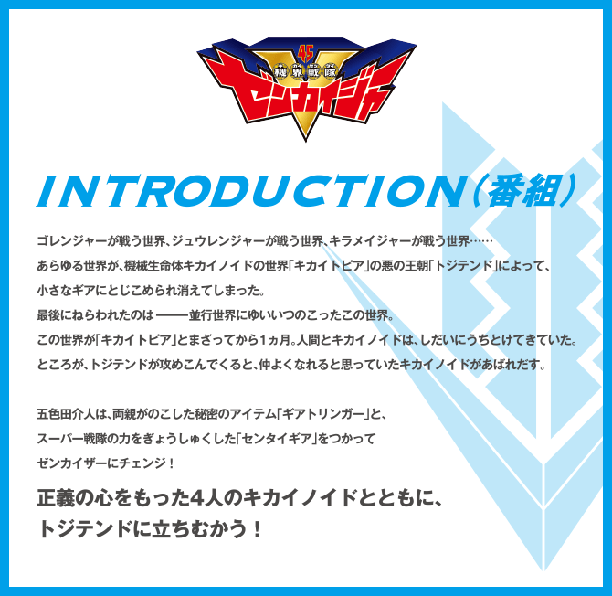 - ゴレンジャーが戦う世界、ジュウレンジャーが戦う世界、キラメイジャーが戦う世界…… あらゆる世界が、機械生命体キカイノイドの世界「キカイトピア」の悪の王朝「トジテンド」によって、 小さなギアにとじこめられ消えてしまった。 最後にねらわれたのはー並行世界にゆいいつのこったこの世界。 この世界が「キカイトピア」とまざってから1ヵ月。人間とキカイノイドは、しだいにうちとけてきていた。 ところが、トジテンドが攻めこんでくると、仲よくなれると思っていたキカイノイドがあばれだす。 五色田介人は、両親がのこした秘密のアイテム「ギアトリンガー」と、 スーパー戦隊の力をぎょうしゅくした「センタイギア」をつかって ゼンカイザーにチェンジ! 正義の心をもった4人のキカイノイドとともに、トジテンドに立ちむかう!