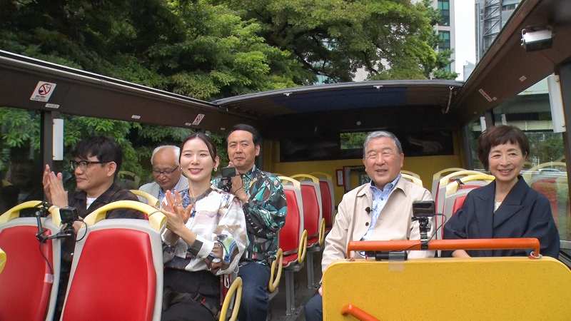 オープンバスに乗って、初夏の風を感じながら銀座まで移動。道すがら、阿川さん・徳光さんの銀座老舗料理店にまつわるおいしい思い出話も…