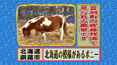 カロンという名のこのポニーの背には 北海道の模様がくっきりと浮かんでいる。 音別町の佐藤牧場で生まれ育ったこのカロンには 生まれた時からこの形の模様があったのだという。 ちなみに、取材のときに妊娠していたカロンは 無事出産。赤ちゃんには模様はないそうです。 ![]() 【珍百景No.79】