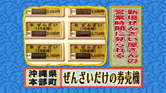 “氷ぜんざい”の一種類だけ。 しかし、店内に置かれた自動券売機の40コのボタンは 全て埋まっている。一体これはどういうことなのか!? よく見ると、この40コのボタンは全て氷ぜんざいで、 店内・持ち帰り、それぞれ1名様〜20名様にふりわけ られている。お店の方によると、団体で訪れる客が 多いため、このシステムは客も店側も楽なのだそう。 ![]() 【珍百景No.80】