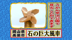 「うかん常山公園」にある、風を受けて クルクル回る巨大な石の風車。 高さ約5m、羽部分は直径2.5m・重さ2tという、 実に大きなこの風車は、羽と本体との連結部分に 精度の高いベアリングを取り付けているおかげで、 風速3m程の風でも軽快に回るのだそう。 公園内にはこの他にも大小様々な石の風車がある。 ![]() 【珍百景No.71】
