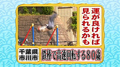 浅井靜治さん(80歳)が公園の鉄棒でグルグルと連続で回転する光景。 浅井さんが鉄棒を始めたのはだいたい50歳の頃からなのだそう。 ちなみに、今までの最高回転数は40回ということでした。 |