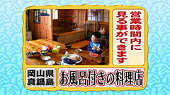 およそ300人が暮らす島の名物・獲れたての新鮮な魚が楽しめる 「漁師料理 漁火」の店内、お客さんが食事をするのと同じ空間に お風呂が設置されている!? これは、お風呂が大好きなご主人・山下さんが、 「いつでもお風呂に入れるように」と作ったものなのだそう。 予約をすればお客さんでも入ることができるそうです。 |