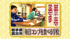 小学生10人、中学生10人が通う「田老第三小学校・中学校」では、 毎日、帰りの会で全校生徒がコンブを食べていた!! 全ての授業が終わると、職員室にはクラスの分の「カミカミコンブ」を もらいにくる子ども達が続々と登場。 コンブを手に教室に戻ると、先生と一緒にみんなでカミカミ。 これは、コンブを噛むことで唾液が多くなり、唾液の持つ抗菌作用で 虫歯予防になるということで、3年前から始まった習慣。 この「カミカミコンブ」は地元の特産であるコンブを自分たちで収穫した もの。 毎年7月に1年分のコンブを漁師さんと一緒に収穫し、乾燥させたものを 職員室で保管し、毎日食べられるようにしているのだそう。 |