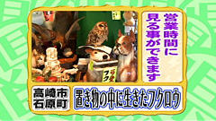 高崎白衣大観音の近くにあるお土産物店「かどや」の店内、 所狭しと並べられた置き物の中にふくろうの置き物…と思いきや、 なんと、生きた本物のふくろうが商品に紛れていた!! コミミズクの福ちゃんは、「かどや」で暮らすようになってから 約4年の間、毎日朝9時〜夕方5時まで店番をしているのだそう。 しかしこの福ちゃん、置き物と一緒に並んでいるため、 売り物と間違われることもあるのだとか…。 |