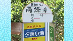 西東京バスの路線に「雨降り(あめふり)」というバス停がある。 その昔、この町にあった滝は、雨が近づくといつもより多く 水が流れるため、町の人々は滝を見て天気を占ったそう。 そのことから、この地域は「雨降り」と呼ばれるようになったそう。 ちなみに、西東京バスには、童謡「夕焼け小焼け」の 作詞者・中村雨紅さん生誕の地であることから名付けられた 「夕焼小焼(ゆうやけこやけ)」という名前のバス停もある。 ![]() |