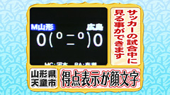 Jリーグ モンテディオ山形のホームスタジアム 「NDソフトスタジアム山形」の電光掲示板の得点表示が サッカーの試合が行われている時だけ顔のように見える光景。 後半に入るとカッコ内の下部分にも表示が出るため、 残念ながら顔ではなくなってしまう。 |