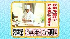 本格的な寿司をお客さんに振舞う民宿「洋望荘」で 小学6年生の少年が客前で見事にお寿司を握る光景。 “小手返し”という寿司の手法もバッチリ体得し、 炙りも見事にこなすこの少年は佐藤元重くん(11歳)。 元重くんは調理師免許をまだ取得できないので、父親が サポートし、サービスとしてお客さんにお寿司を提供している。 3歳から寿司を握り始めたという元重くんは、学校から帰ると 調理場に直行し、お店で使うシャリを準備する日々を送る。 すでに魚の3枚おろしや、大根のかつら剥きも マスター済みの元重くんは、将来 寿司職人として 世界を舞台に活躍するのが夢なのだそう。 |