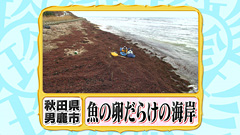海岸一面に赤くて丸い物体が広がり真っ赤に染まっている…。 この赤い物体の正体はブリコというハタハタの卵。 ハタハタは冬になると浅瀬で産卵するのだが、 あまりにも数が多いため海草に産みつけられないものなどが 波で打ち上げられてこのような光景が生まれるのだそう。 ちなみに、繁殖保護のため、条例で産卵後のブリコの採取は 禁止されているため、打ち上げられた卵も採ってはいけないそう。 |