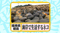 姫島の海岸で生活するたくさんのネコを発見! 波打ち際でエサを探すネコたちは波を恐れる様子もなく、 波よけのコンクリートブロックで生活している様子。 小魚などが海岸に打ち上げられ、エサに困らないため いつしか、姫島のネコたちは海岸で暮らすようになったそう。 |
