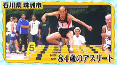 桜井久一さん(84歳)が自宅の敷地に練習場を作り 高さ約70cmのハードルを跳んだり、幅跳びの練習をしている。 桜井さんは、100m走・80mハードル・400m走・1500m走・やり投げ・円盤投げ・砲丸投げ・走り幅跳び・高飛び・棒高跳びを一人で行い、 合計記録で競う陸上10種競技の選手として マスターズ陸上に出場するスーパーアスリートおじいちゃん。 55歳の時に健康のために趣味でジョギングを始めた桜井さんは、 65歳の時にたまたま十種競技と出会い、同年代の人々のがんばりに 感銘を受けたことがきっかけで十種競技を始めたそう。 桜井さんは8年前、自分の土地に手作りで専用練習場を作って 毎日数時間のトレーニングに励み、 2006年にアジア新記録を更新したという。 |