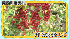 ぶどうのように1つの房にたくさんの実をつけるリンゴが存在した! この光景が見られるのは土田園。 このリンゴは「アルプス乙女」という品種で、通常のリンゴと比べると かなり実が小さく、普通のリンゴよりも狭い間隔で実をつけるのだが、 通常は間引き作業をするため、これほど実が密集することはない。 この木は間引きをしていないため、 自然のままに育ち、このように生長したそう。 |