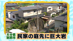 のどかな住宅街にある一軒の民家の庭先に巨大な岩が!! およそ1200年前、鶴見山が大噴火した際、飛んできた溶岩が 冷えて固まって巨大岩になり、その後、住宅街が造られたが、 岩が大きすぎたため、そのままになったという。 ちなみに、この岩のある土地は民家の庭ではなく 別府市役所が管理している土地なのだそう。 |