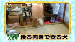 小野さんご家族の愛犬・くーちゃん(ポメラニアン)が リビングと座敷の間の段差をバックで登る光景。 飼い主さんが教えたわけではなく 半年前に突然この登り方を始めたというくーちゃん、 今では100%後ろ向きで登るようになったという。 後ろ向きに登る理由は定かではないが、 たまたま後ろ向きで登ったところ飼い主が喜んだため、 毎回やるようになったのではないかと考えられる。 |