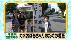 交通量の多い道路の脇に 「カメが渡るスピード落とせ」という注意看板が置かれている。 沖縄のおばあさんには「カメ」さんという名前が多いため、 「カメおばあちゃんが通ることもありますよ」という意味で、 お年寄りに気をつけて運転してもらいたいと設置したそう。 |