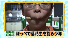 以前、「ヘコませて挟む少年」(2011年5月4日放送)を投稿してくれたが 残念ながら登録ならずに終わった有哉くんからリベンジ投稿! なんと、落花生をほっぺに挟んで殻を割ってしまった! |