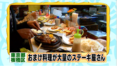 約45年前に夫婦2人で開店したという「ステーキふじ」では 注文したステーキが焼けるまでの間、 ポテトフライ、キャベツのサラダ、フルーツの盛り合わせ、 しそカツ、エビフライなど、大量の「おまけ」が次々サービスされる! 店主の矢ア七朗さん(70歳)いわく、夫婦で店をきりもりしていて 混雑時にはステーキを焼くのに時間がかかるため、 お待たせするお客さんにおまけを出すようになったのだとか。 今では、忙しくなくても常に5品以上のおまけを出すようになり、 残った料理はパックでテイクアウトすることができるそう。 |