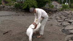 【ノンジャンル珍百景対決(2)】大賞 投稿者・入口イツ子さんの旦那さんの操さん(70歳)は 野生の白鳥をとっても可愛がっていて、 呼ぶと白鳥が海からやって来て操さんと遊ぶ。 その光景はまるで白鳥に襲われているようだが、 操さんはとっても楽しそうにしている。 鴨にエサをやっていたところにやって来たという白鳥に 最初はただエサを与えていただけだそうだが、 どんどん仲良くなり、白鳥からの強烈なアタックが始まったそう。 |