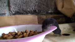 【ノンジャンル珍百景対決(1)】ノミネート 投稿者・平沢さんのお宅では壁の隙間から入ってきた ヒミズという小動物が室内に置いてあるネコのエサを盗んでいく! ヒミズはモグラの仲間で、低い山や草原の落ち葉の下に生息し、 目がほとんど見えないところはモグラと似ているのだが、 モグラと違い手が小さく、大きな穴を掘らないため、 壁の隙間を探して入ってくるようになったと考えられる。 専門家によるとヒミズが室内に出没するのは大変珍しいことだという。 |