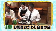 魚料理が自慢の「お食事の店 萬福」では、 「刺身梅定食」(1050円)を注文したお客さんは お刺身のおかわりが何回でもできる!! 平戸のおいしい魚を多くの人に知ってもらおうと、2年前から刺身定食限定でおかわりサービスを開始したそう。 ちなみに、お刺身はおかわりし放題ですが、 ごはんのおかわりは有料なのだとか。 |