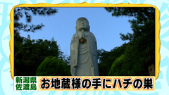 田園風景の中にそびえる約17.5mの大きなお地蔵様の 合掌した手元に抱かれるかのように 巨大なスズメバチの巣がある光景。 このお地蔵様は地元では幸福地蔵と呼ばれているそう。 ![]() |