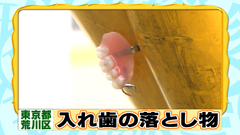 駅前商店街にある電柱のワイヤーカバーに なぜか部分入れ歯が挟まっている! 半年ほど前から目撃情報のあるこの落とし物、おそらく、近くの荒川区社会福祉協議会の事務所にある不要入れ歯回収BOXに入れようとした人の落とし物では…と考えられる。 |
