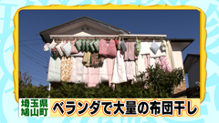 普通の民家のベランダに大量の布団が びっしりと干されている光景。 現在この家に暮らしているのは3人だというが、 このお宅に暮らす藤原さんは、28年前から 晴れた日は欠かさずこの量の布団を干しているという。 というのも、いつもフカフカの布団で寝る藤原さん家族は 天気が悪くて布団が干せない日もフカフカの布団で寝られるよう 前日使ったものとは違う予備の布団で眠るため、 とにかく晴れたら布団を干しているのだという。 毎日の布団干しには、布団を出すのに30分、 取り込むのに30分かかるのだとか。 |