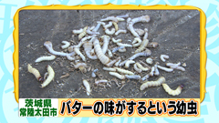 ニワトリを育てたり、野菜を栽培して 自給自足の生活を送っている北山さんが教えてくれた レアな食材とは…薪の中にいるカミキリムシの幼虫。 フライパンで軽く炒って食べるというこの幼虫… クリーミーでバターのような味がするのだとか。 |