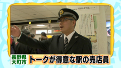 大町市から富山県の黒部ダムまでを結ぶ 関電トロリーバスの始発駅「扇沢駅」構内で、 改札前の人だかりに向かって軽妙なトークで お弁当やようかんを販売する、駅員の格好をした売店員。 売店員の中里さんは、30分に1本のトロリーバスを待つ お客さんの退屈しのぎにと、7年前から 笑いを交えた接客をするようになったという。 その際、親しみやすいように駅員の制服を借りているそう。 |